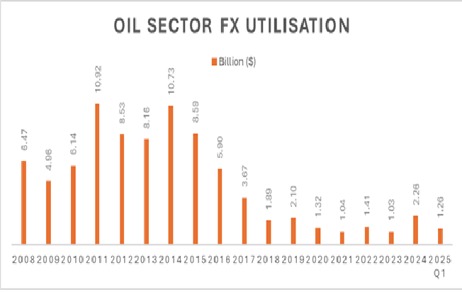 Between 2008 and 2014, FX demand from the oil sector averaged over $8 billion annually, peaking above $10 billion in 2011 and 2014. However, from 2016 onward, utilisation dropped below $2 billion, reaching as low as $1.03 billion in 2023 (see chart below).